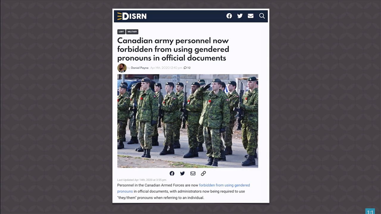 What’s your “preferred pronoun?” Well, it apparently doesn’t matter if it’s “he” or “she” to the Canadian Armed Forces because—in the name of “gender diversity”—only the so-called gender-neutral pronouns they/them will be used in official military documents.