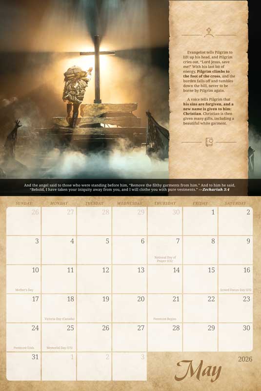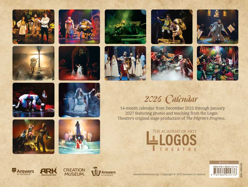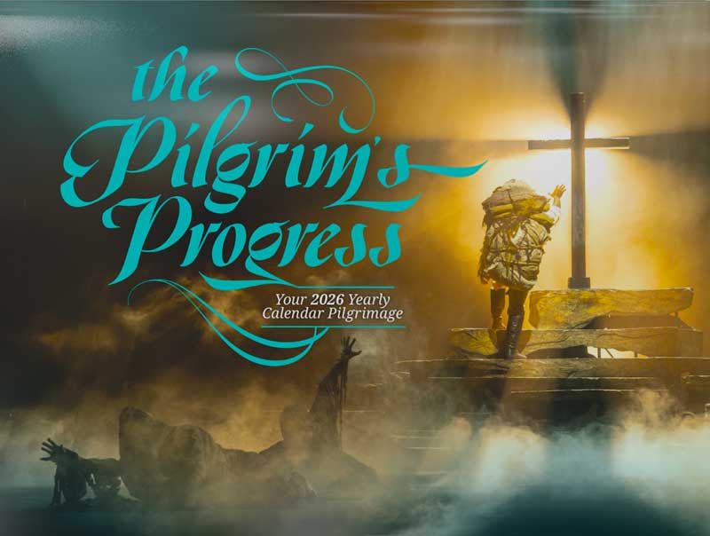 This 14-month calendar (December 2025–January 2027) features spectacular photos from the Logos Theatre production of The Pilgrim’s Progress. Follow along with Pilgrim on his journey from the City of Destruction to the cross to the Celestial City.
