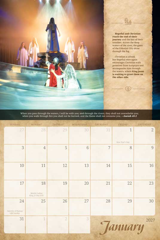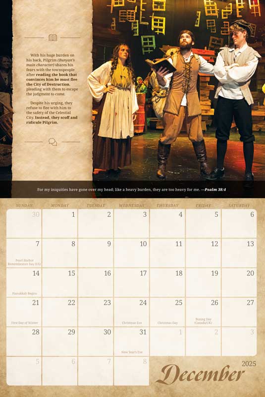 This 14-month calendar (December 2025–January 2027) features photos from Logos Theatre’s stage production of The Pilgrim’s Progress, a short summarization of each pictured scene, and a corresponding scripture. Follow along month-to-month with Pilgrim as he journeys from the City of Destruction to the cross to the Celestial City.