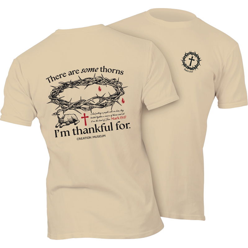 There are some thorns to be thankful for, and this t-shirt is a reminder and declaration of gratitude for Jesus’ sacrifice on the cross. Featuring a lamb lying beside a crown of thorns and Bible verse Mark 15:17.