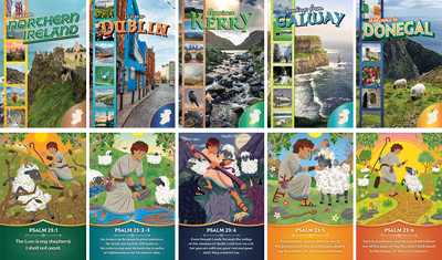 Decorate your VBS areas with these large, beautiful posters. Features 5 scenes from around the Emerald Isle (5 panels), and 5 scenes from the life of David (5 panels—each panel is double-sided with ESV on one side and KJV on the other side), Each panel is approximately 42.3 x 62.6 in. Shipped in rolls. Not returnable.