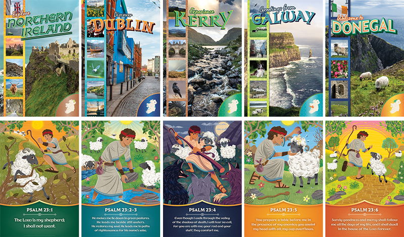 You will need a wide-format printer to print these posters yourself. Decorate your VBS areas with these large, beautiful posters. Features 5 scenes from around the Emerald Isle (5 panels), and 5 scenes from the life of David (5 panels—each panel is double-sided with ESV on one side and KJV on the other side), Each panel is approximately 42.3 x 62.6 in. Not returnable. Having these printed at local copy stores can be very expensive. Please check pricing before purchasing the PDF.