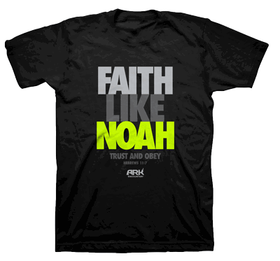 The Bible describes Noah as “a just man, perfect in his generations” who “walked with God.” He appears in the Hall of Faith in Hebrews 11 with this description, “By faith Noah, being divinely warned of things not yet seen, moved with godly fear, prepared an ark for the saving of his household, by which he condemned the world and became heir of the righteousness which is according to faith” (Hebrews 11:7). Be encouraged to follow the godly, faithful example of Noah with this trendy t-shirt.