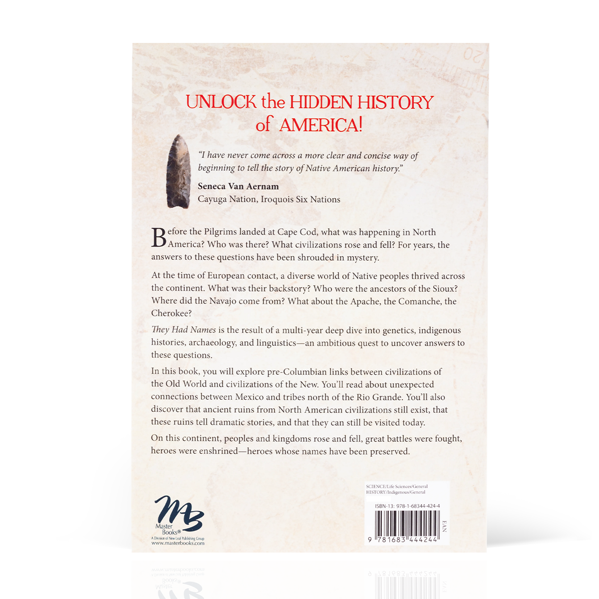 They Had Names is the result of a multiyear deep dive into genetics, indigenous histories, archaeology, and linguistics—an ambitious quest to uncover answers to the secrets of pre-Columbian North American history, to restore the rightful respect and appreciation for the peoples who were here before Europeans, and to show how creation science is making testable genetic predictions and seeing those predictions fulfilled by later experiments.